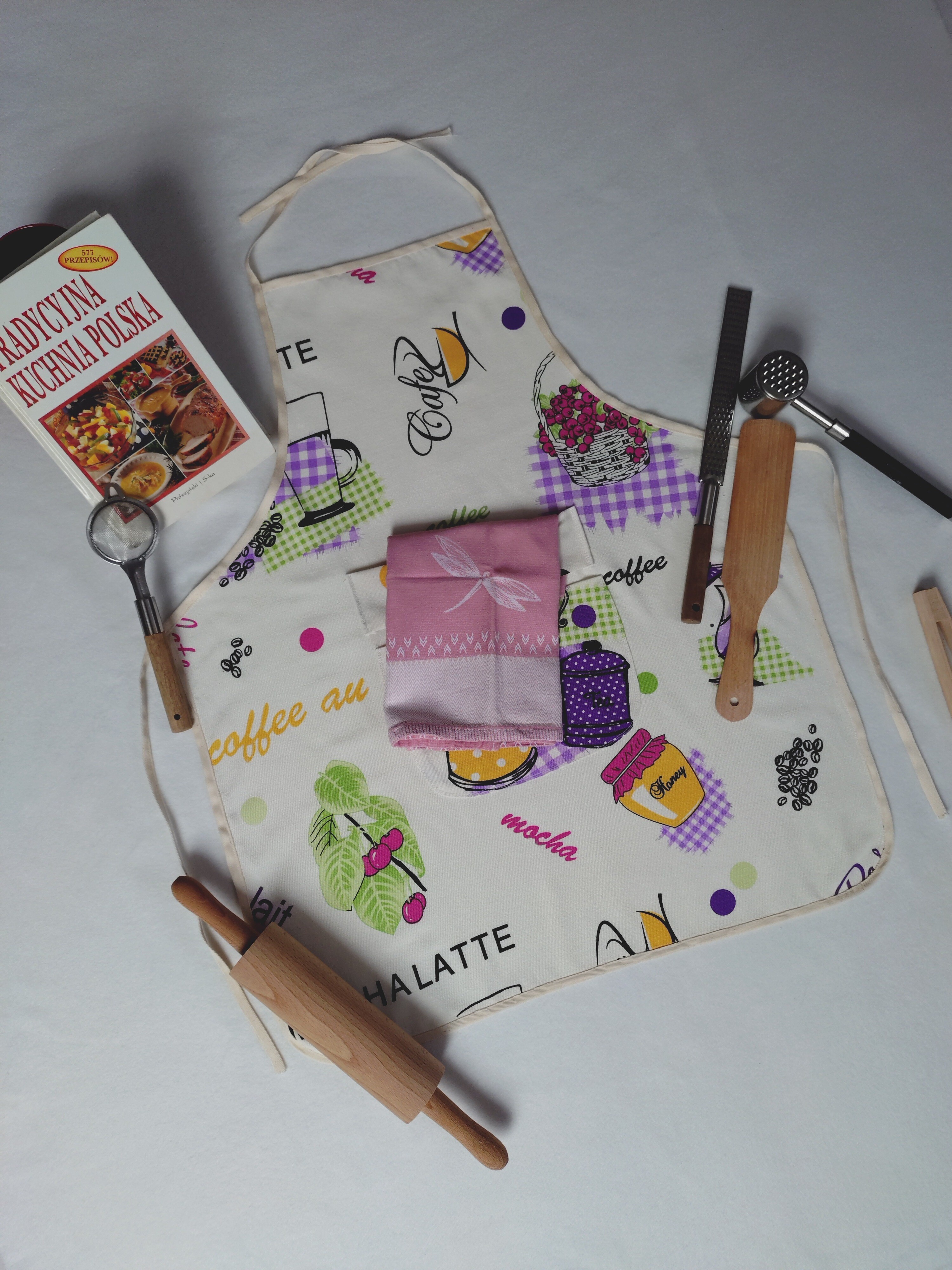 Bawełniany fartuch kuchenny ecru w kolorowy motyw naczyń, akcesoriów i produktów dla osoby dorosłej